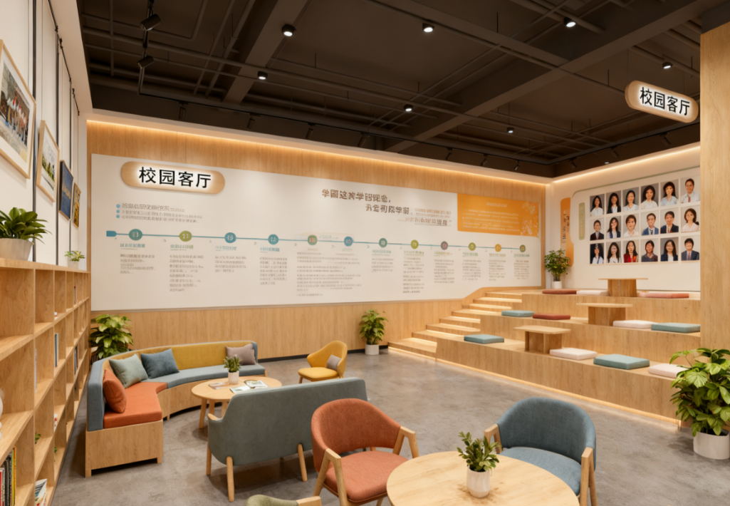核心理念:打破传统展厅的刻板印象,将其打造成一个集展示、学习、交流、休憩于一体的“校园客厅”。